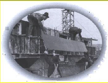 Workers hoist portable steel molds used to construct poured concrete homes in Luzerne County, 1911