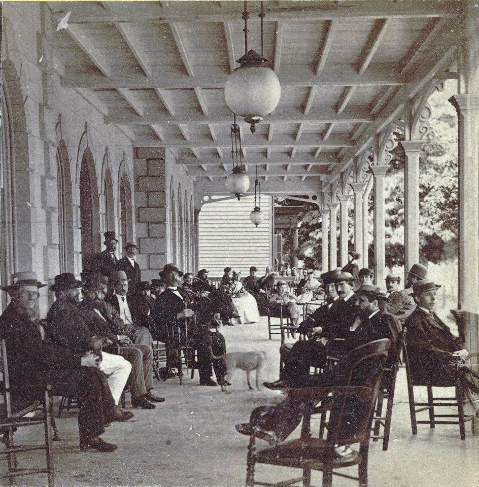 On the front porch of the Wyoming Valley House (Hotel) on South River Street in Wilkes-Barre - where Guard Insurance Company building is today. c. 1880s